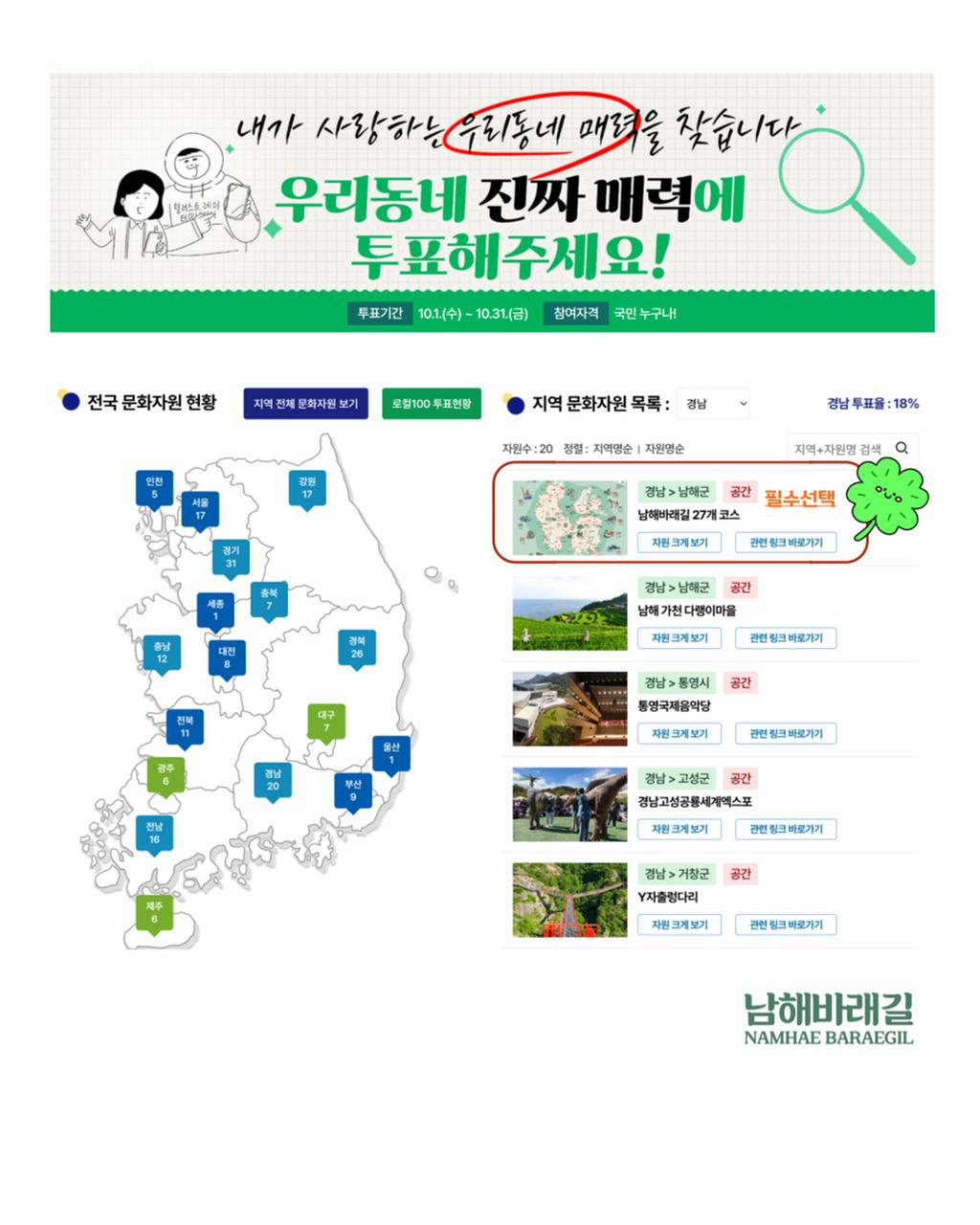 남해바래길이 대한민국을 대표하는 길로 선정될 수 있도록 군민 여러분의 적극적인 참여를 바랍니다.