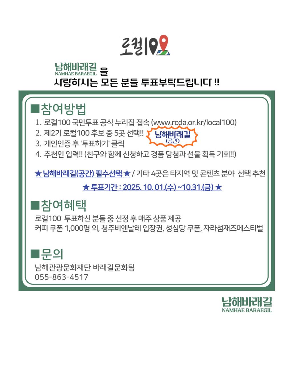 남해의 대표 걷기길인 남해바래길이 문화체육관광부와 지역문화진흥원이 주최·주관하는 제2기 「로컬 100」 후보로 선정되어 국민투표가 진행 중입니다.